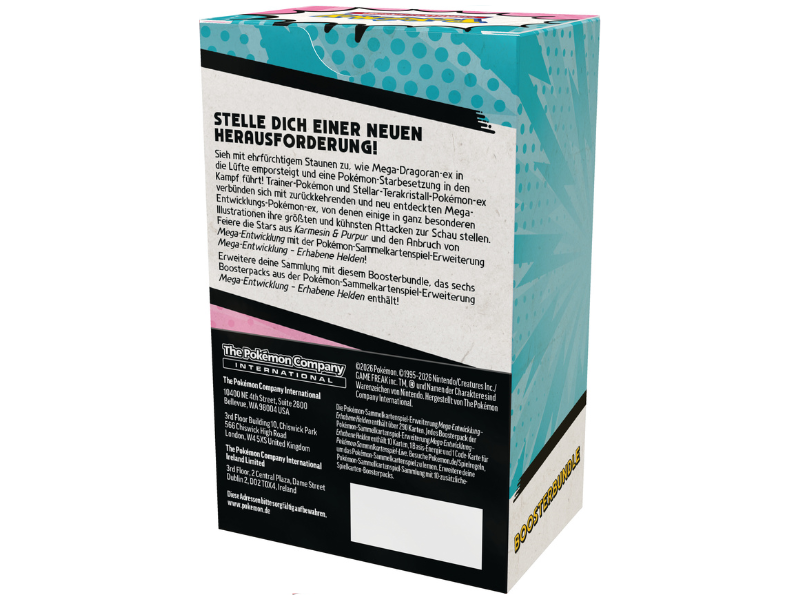 Sieh mit ehrfürchtigem Staunen zu, wie Mega-Dragoran-ex in die Lüfte emporsteigt und eine Pokémon-Starbesetzung in den Kampf führt! Trainer-Pokémon und Stellar-Terakristall-Pokémon-ex verbünden sich mit zurückkehrenden und neu entdeckten Mega-Entwicklungs-Pokémon-ex, von denen einige in ganz besonderen Illustrationen ihre größten und kühnsten Attacken zur Schau stellen. Feiere die Stars aus Karmesin & Purpur und den Anbruch von Mega-Entwicklung mit der Pokémon-Sammelkartenspiel-Erweiterung Mega-Entwicklung - Erhabene Helden!