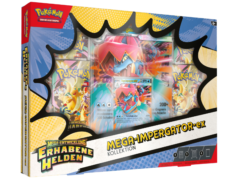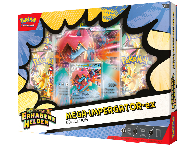 Schmiede eine Bindung, durch die dein Partner-Pokémon mithilfe der Mega-Entwicklung über seine Grenzen hinauswächst! Mega-Impergator-ex fletscht die Zähne und nimmt die angeschlagen Pokémon des Gegners mit Letalknirscher ins Visier! In dieser Kollektion erwartet dich Mega-Impergator-ex als spielbare holografische Promokarte. Erhalte außerdem eine überdimensionale Wackelbildkarte mit dynamischer Illustration und vier Boosterpacks aus der besonderen Erweiterung Mega-Entwicklung - Erhabene Helden.