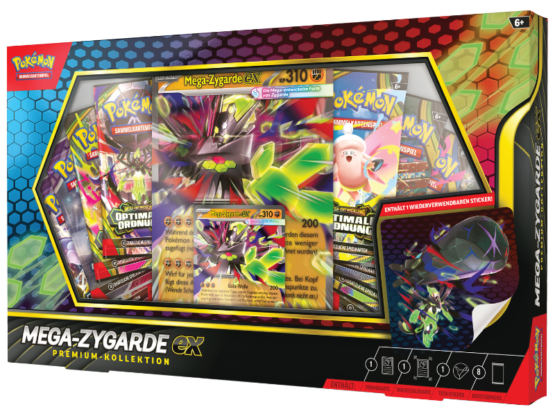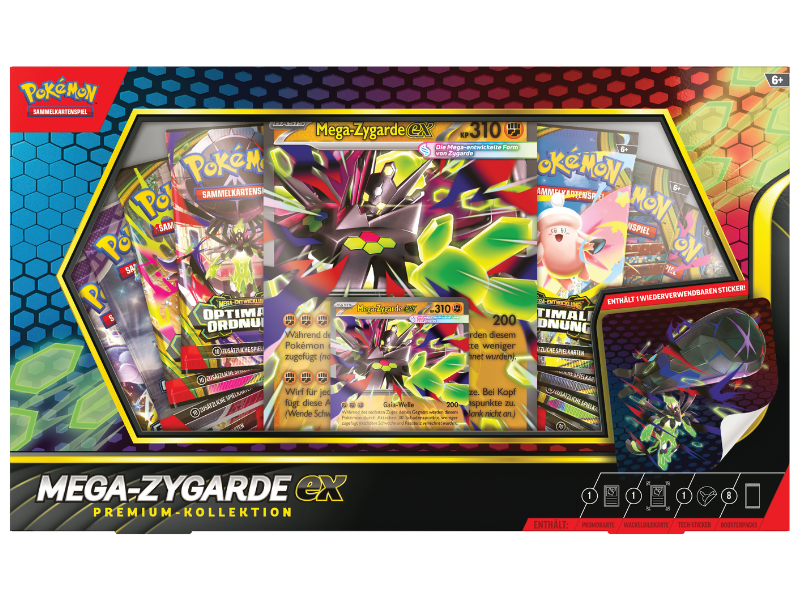 Das Legendäre Zygarde überrascht die Welt als Mega-Entwicklungs-Pokémon-ex mit mehr Macht als je zuvor! Seine gewaltigen Attacken können die Strategie des Gegners zunichtemachen, indem sie seine Pokémon mit Schaden überwältigen. In dieser Kollektion erhältst du eine spielbereite holografische Promokarte mit Mega-Zygarde-ex, eine überdimensionale Wackelbildkarte und einen Tech-Sticker zum Ausstellen. Freue dich außerdem auf einen Stapel Boosterpacks aus verschiedenen Erweiterungen des Pokémon-Sammelkartenspiels.